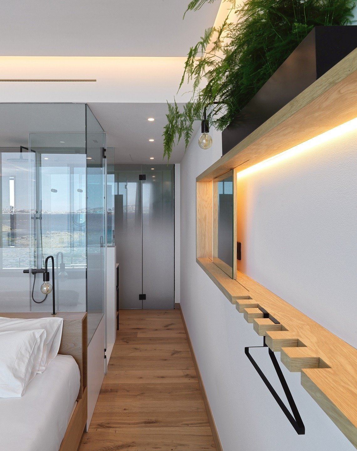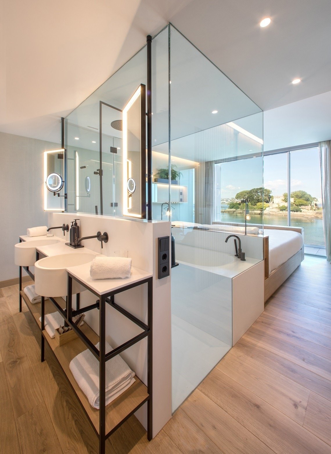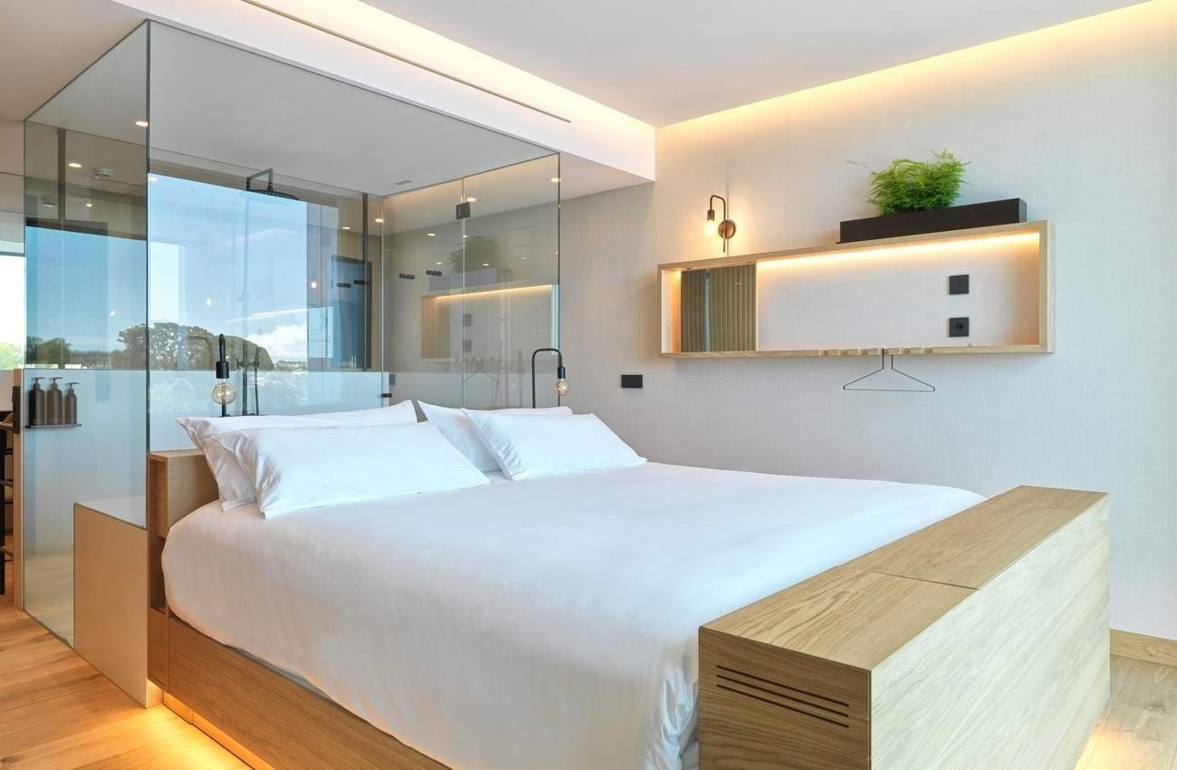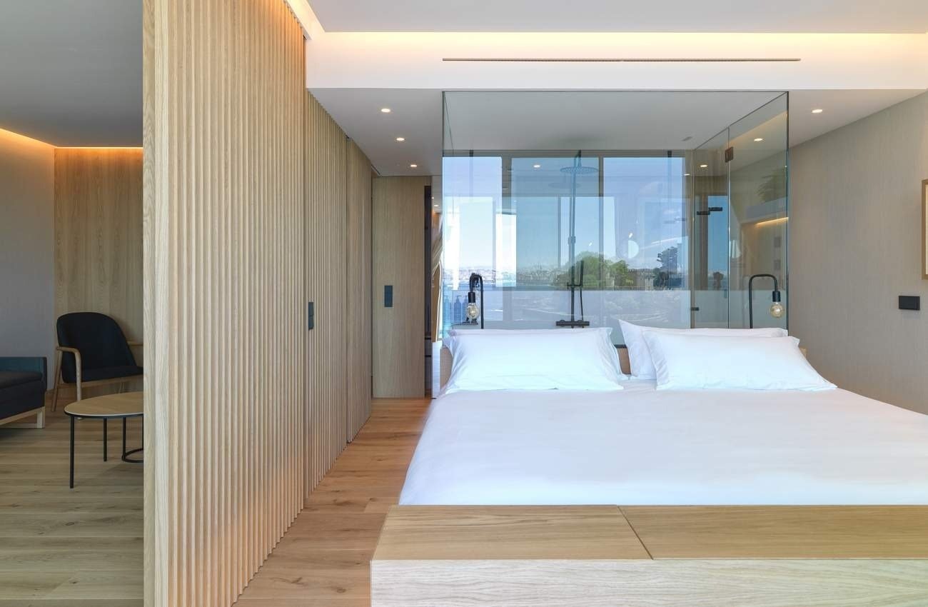 Intimidad y amplitud hacen de esta suite una estancia excepcional. Moderna, luminosa, 60 m2 que se distribuyen en dos zonas conectadas con terraza y vistas al mar.